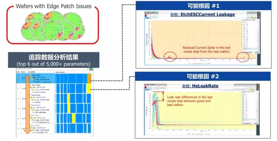 BISTel的HMP(Health Monitoring & Prediction)在數(shù)據(jù)追蹤中,系統(tǒng)列出總共6個導(dǎo)致良率問題的最優(yōu)關(guān)聯(lián)度參數(shù),其中前兩個分別是蝕刻工序的最后一步,電流發(fā)生激增;以及氦氣值明顯降低(圖1)。蝕刻流程的最后一步就是氦氣分離,這一例的“根因”就是在分離過程中,托盤與晶圓邊緣接觸,產(chǎn)生小范圍火花——所以電流出現(xiàn)了激增,與此同時托盤某些氦氣口堵塞造成氦氣值降低。