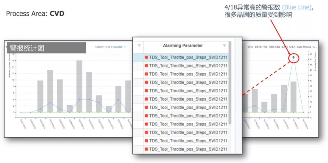這里的“知識庫”即是AI在W.K. Choi所說“預(yù)測”中的大腦,其中包含所有“知識點”和解決方案,并通過學(xué)習(xí)不斷完善。這里再來看一個例子,在某晶圓廠半導(dǎo)體制造CVD(化學(xué)氣相沉積)流程中,追蹤發(fā)現(xiàn)某一天(本例為4月18日)出現(xiàn)了異常高的報警數(shù),很多晶圓質(zhì)量都受到影響(圖2)。報警內(nèi)容為:“TDS”設(shè)備某節(jié)氣閥發(fā)生位置偏移。如果這份數(shù)據(jù)拉長到為期半個月,那么很容易發(fā)現(xiàn),在高報警事件發(fā)生的前兩天,數(shù)據(jù)就已經(jīng)顯現(xiàn)出節(jié)氣閥位置發(fā)生潛在漂移——而且早在10天以前,前序壓力就因為節(jié)氣閥位置偏移而出現(xiàn)不規(guī)則現(xiàn)象。