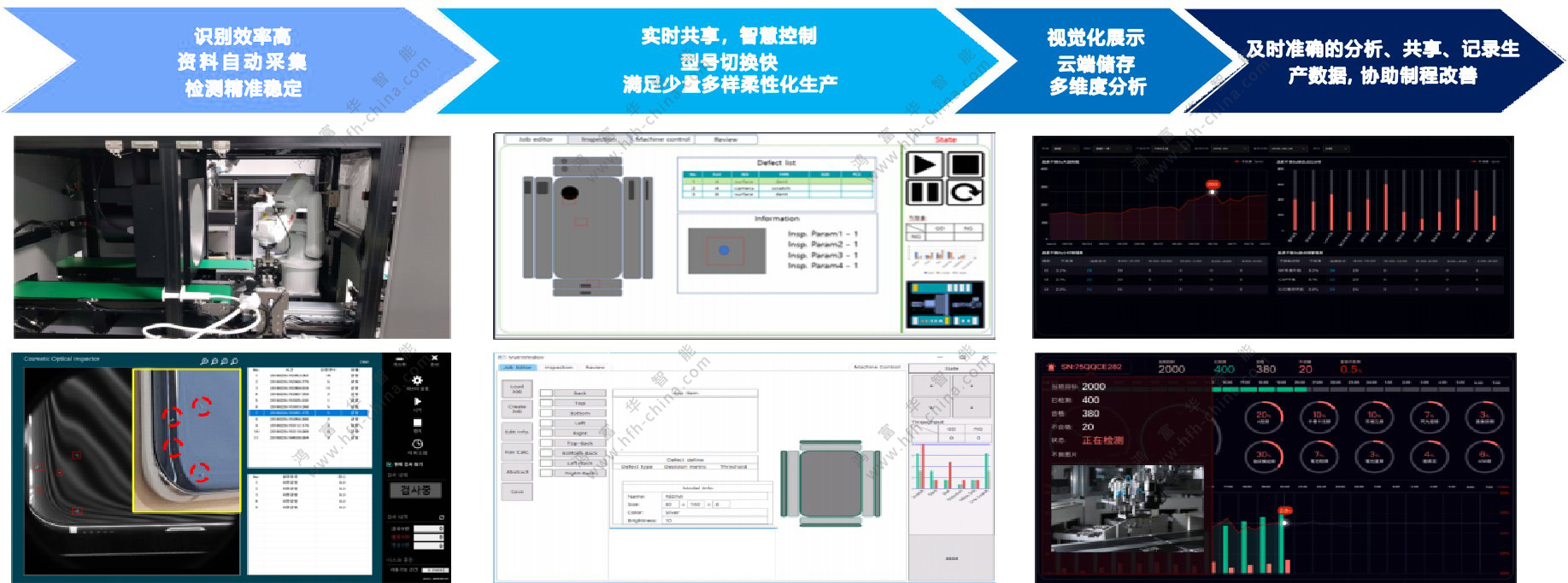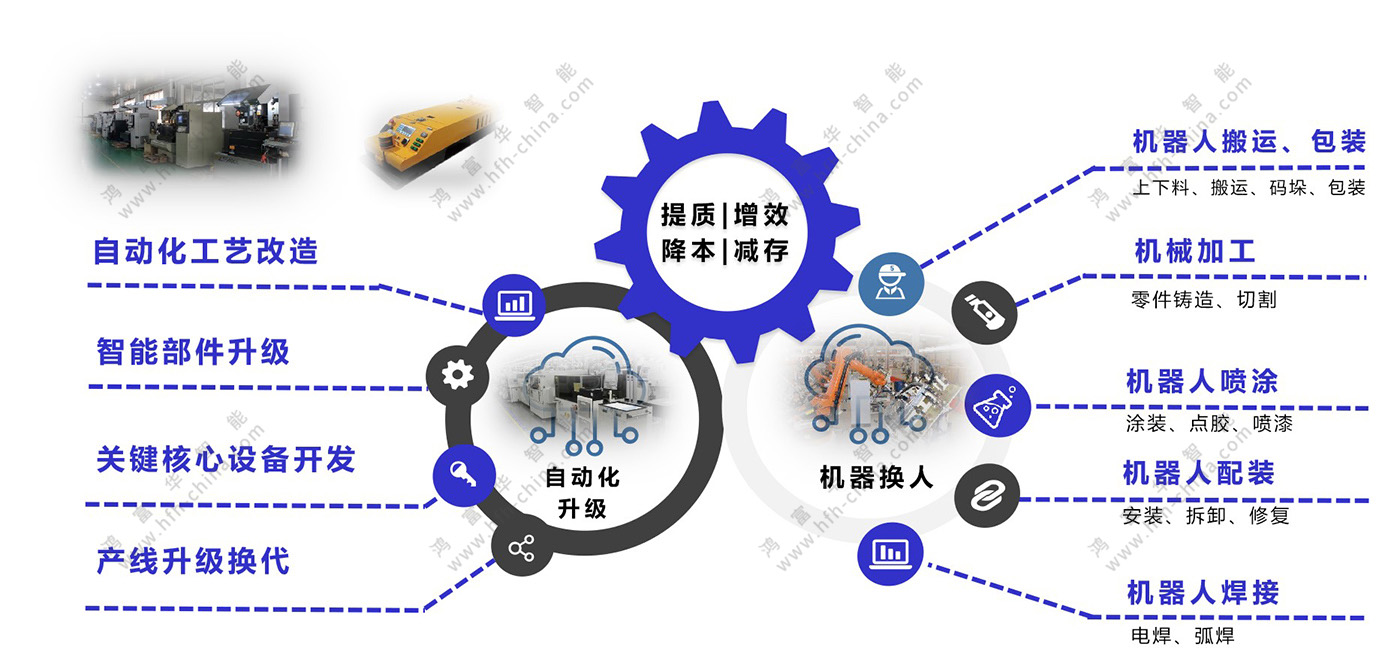 鴻富華提供自動(dòng)化生產(chǎn)線設(shè)計(jì)、機(jī)器換人與設(shè)備智能化升級(jí)改造、AI視覺(jué)檢測(cè)服務(wù)。幫助企業(yè)合理的規(guī)劃生產(chǎn)線,實(shí)現(xiàn)生產(chǎn)高效、產(chǎn)線穩(wěn)定、人機(jī)搭配合理、避免投資風(fēng)險(xiǎn)、操作維護(hù)標(biāo)準(zhǔn)化的目的。同時(shí),通過(guò)自動(dòng)化(含AI視覺(jué)檢測(cè)設(shè)備)導(dǎo)入,取代或輔助操作高頻重復(fù)及簡(jiǎn)單、低效率、高人力成本、高體力勞動(dòng)、高風(fēng)險(xiǎn)發(fā)生、高品質(zhì)異常、高精度要求、人力檢測(cè)所難以觸及的生產(chǎn)與檢測(cè)環(huán)節(jié),以提升生產(chǎn)效率、生產(chǎn)安全性、產(chǎn)品品質(zhì),緩解工人勞動(dòng)強(qiáng)度,降低整體成本。其中,通過(guò)設(shè)備的智能化升級(jí)改造,實(shí)現(xiàn)“人、機(jī)、料、法、環(huán)、測(cè)”的信息化覆蓋和數(shù)據(jù)聯(lián)通,推動(dòng)經(jīng)營(yíng)管理各環(huán)節(jié)的更好融合,解決工廠設(shè)備信息孤島、管理職能壁壘等問(wèn)題。